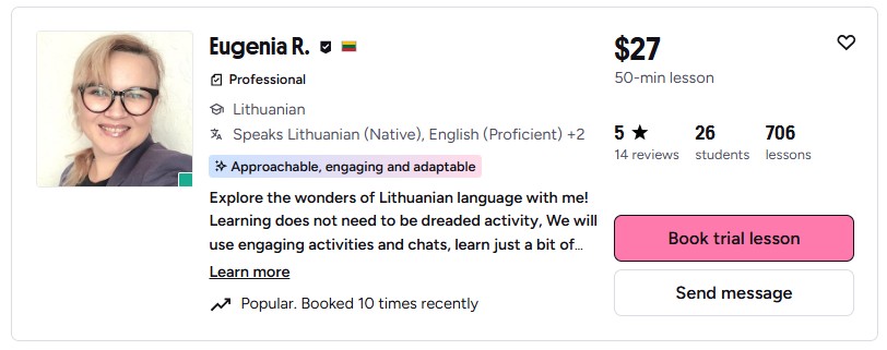 It’s difficult to find a tutor for those who already has quite good language level and wants to improve it more. Here with Eugenia I found exactly what I was looking for. She was very patient, attentive and able to explain not only how it should be according to the grammar, but also how Lithuanians really speak in everyday life. So, whether you’re a beginner, or just need someone to speak with to improve your knowledge, I highly recommend you this teacher.