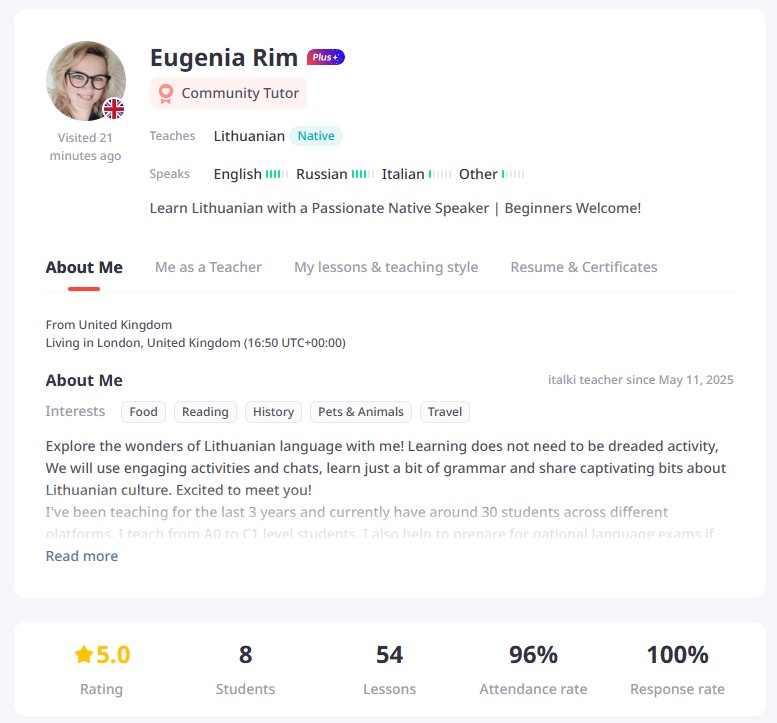 RU: Здравствуйте! Меня зовут Евгения, и я — преподаватель литовского языка. Уже 3 года я обучаю студентов онлайн со всего мира. Я помогаю тем, кто переезжает в Литву для работы или учёбы, тем, кто приезжает сюда в путешествие, а также тем, кто хочет восстановить связь со своими корнями и семьёй. Некоторые мои ученики изучают литовский просто из любопытства и любви к языкам — и мне очень нравится сопровождать их в этом пути. Я пока работаю только со взрослыми людьми. Детей к сожалению необучаю.