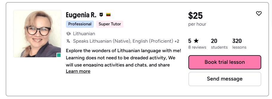 I am fluent in Lithuanian (my native language), English, and Russian, which helps me explain things clearly and guide students with confidence. My goal is to make learning Lithuanian not only effective, but also enjoyable and inspiring.